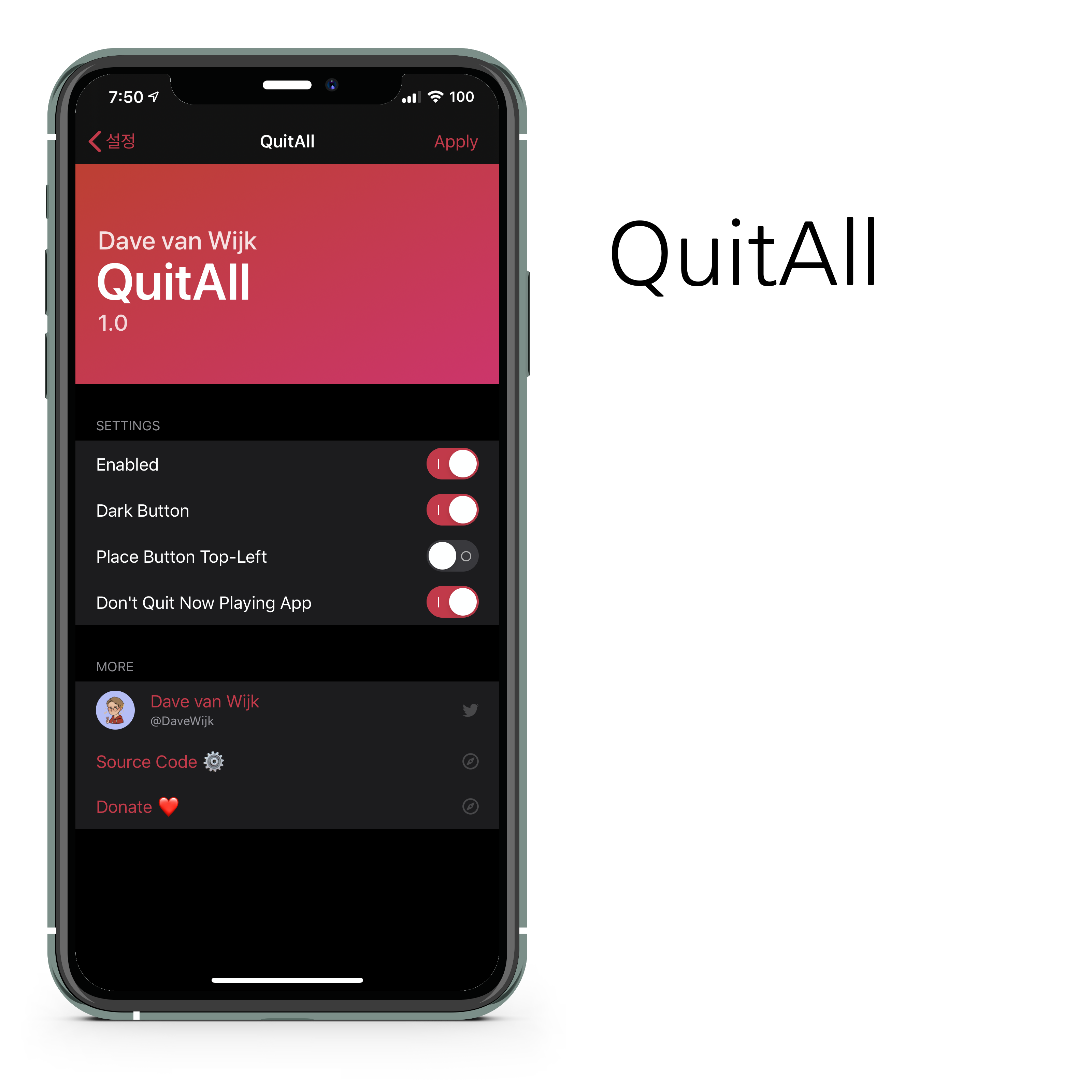 5- 아이폰 > 설정 > QuitAll 의 설정을 확인합니다.
