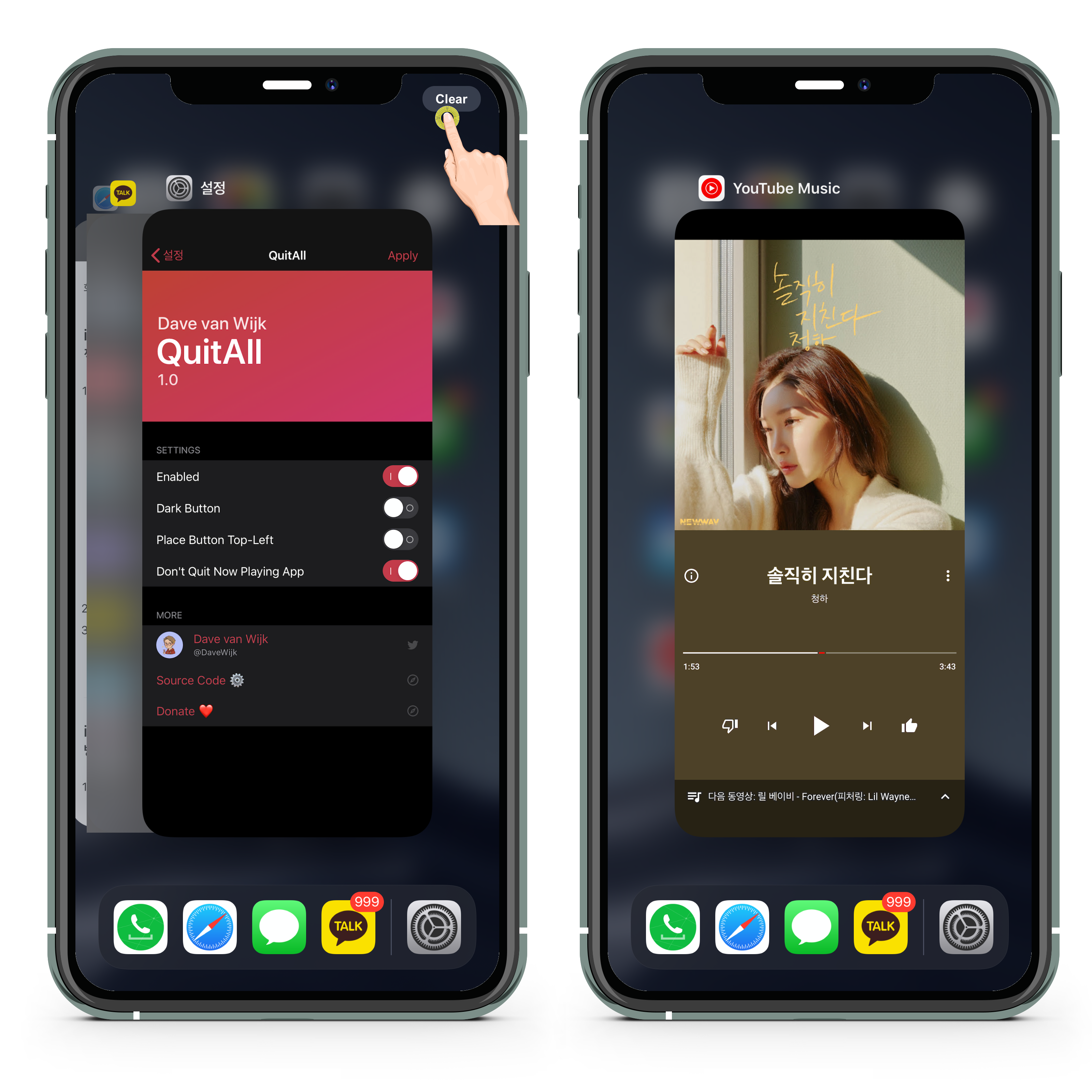 QuitAll 기능을 활성화 하면 어플을 스위치하는 기능을 켰을때, 오른쪽 상단에 Clear 버튼이 생성됩니다.