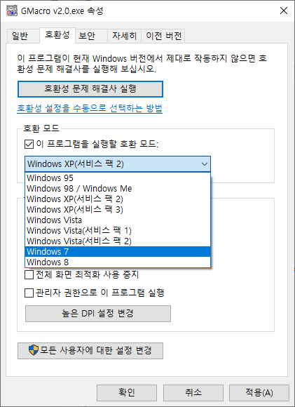 속성 > 호환성 > 이 프로그램을 실행할 호환 모드를 윈도 7로 선택하여 사용하기 바랍니다.