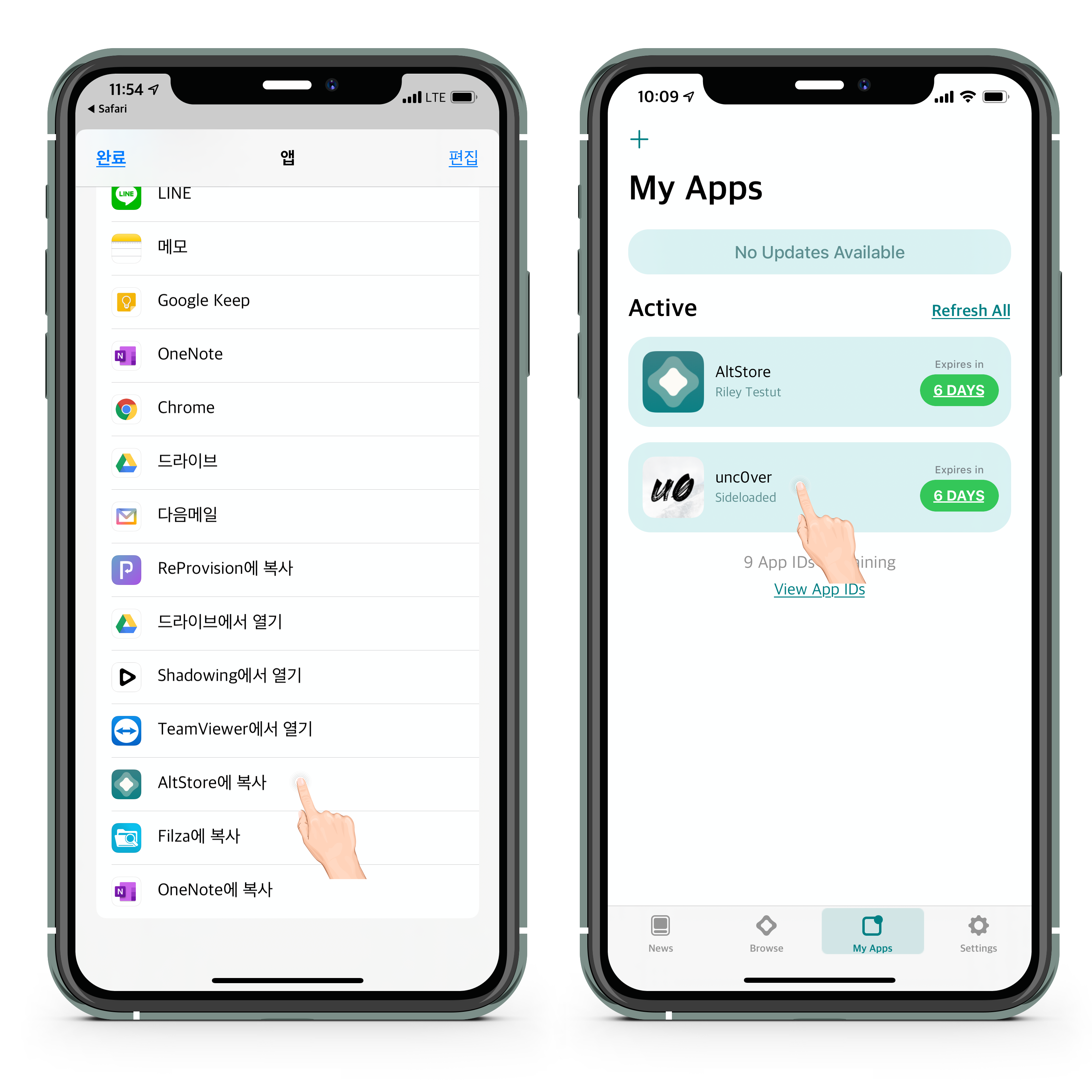 - AltStore 복사를 선택한다. AltStore 가 바로 보이지 않는다면 화면의 오른쪽으로 더보기 버튼을 클릭하여 확인 할 수 있다.