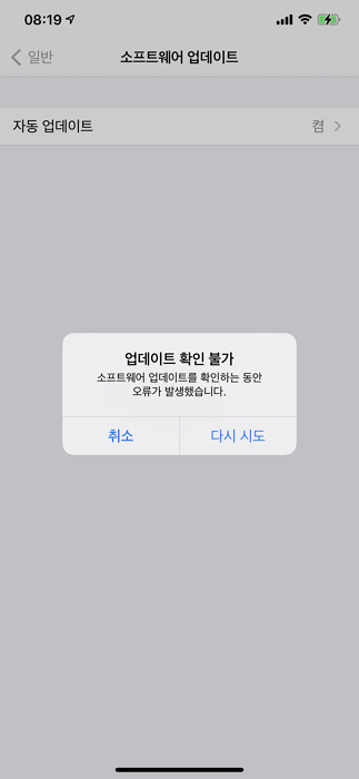 IOS 버전 업데이트 소식이 있어 아이폰에서 업데이트를 하려고 아이폰에서 확인을 하면 다음과 같이 업데이트를 할 수 없다고 에러가 발생한다.