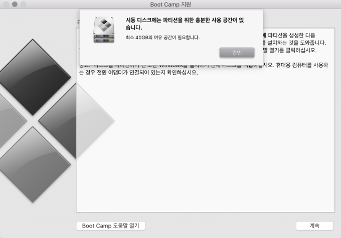 시동 디스크에는 파티션을 위한 충분한 사용 공간이 없습니다. 최소 40GB의 여유 공간이 필요하다.