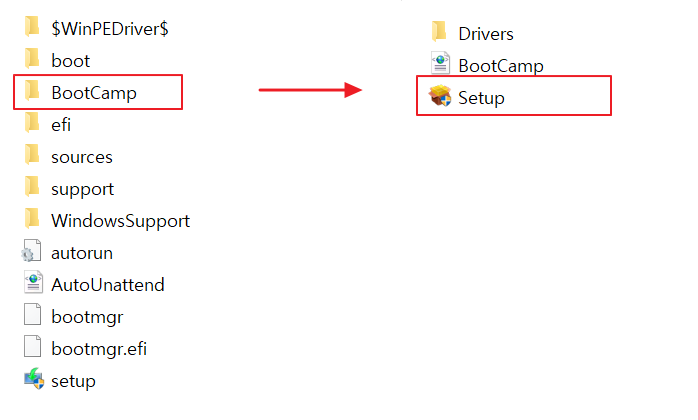 다음과 같이 USB를 살펴보면 BootCamp라는 폴더가 있고 그 안에 드라이버 파일들이 있다. 자동으로 설치하기 위해 setup 을 클릭해서 설치하기 한다.