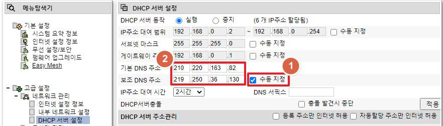 고급설정 > DHCP 서버 설정