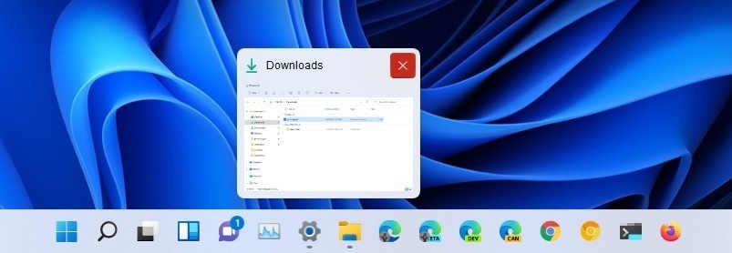 실행 중인 응용 프로그램을 가리키면 작업 표시줄 미리 보기가 Windows 11의 새로운 디자인 언어와 일치하도록 둥근 모서리와 아크릴 재질로 업데이트되었습니다. 또한 미리 보기에 더 일관된 닫기 버튼이 표시됩니다.