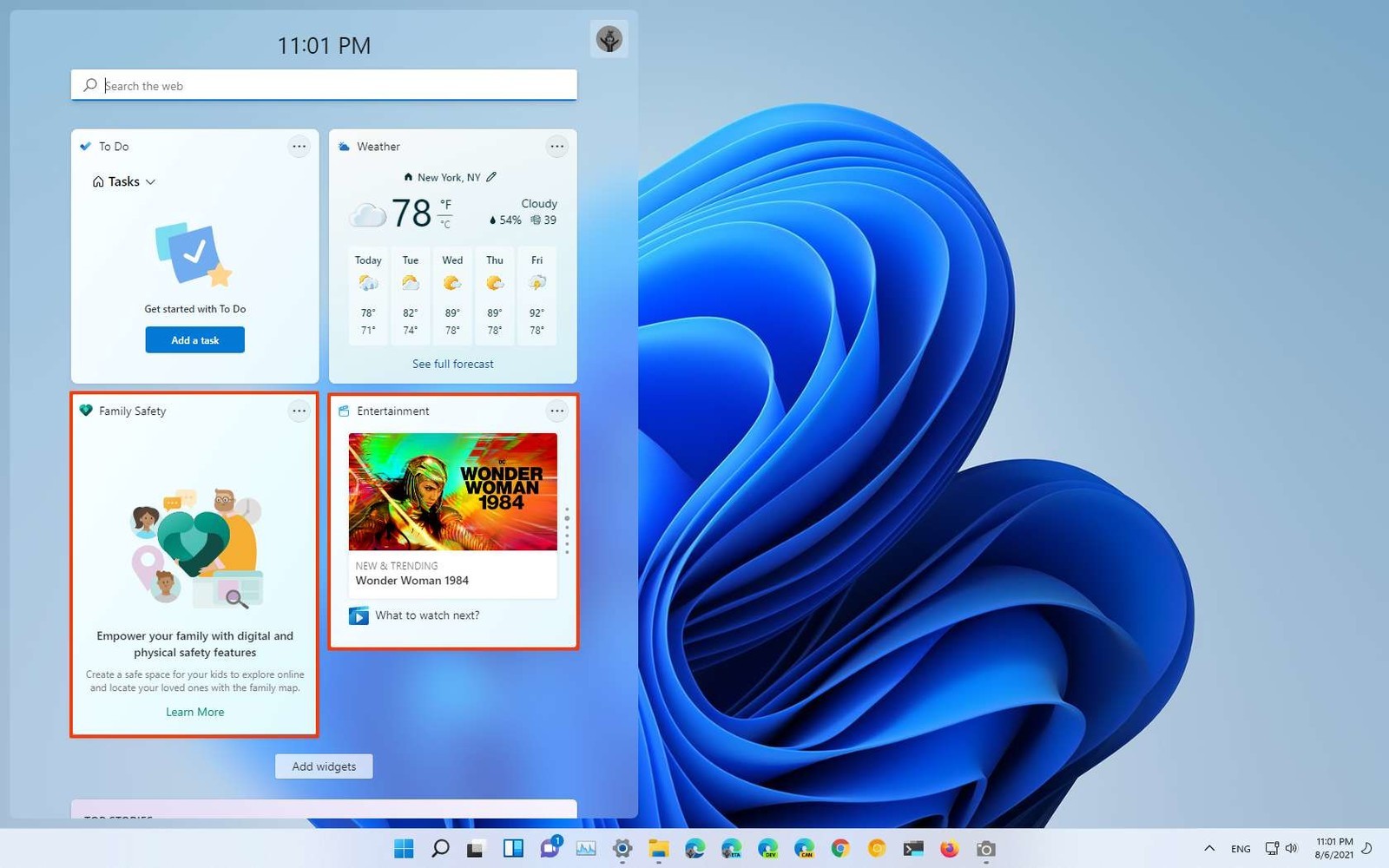 빌드 22000.120부터 Windows 11에는 Microsoft 계정에 연결된 사용자가 가족 그룹 구성원의 최근 활동을 볼 수 있도록 하는 위젯 환경(Windows 키 + W)을 위한 새로운 가족 대시보드가 포함됩니다.