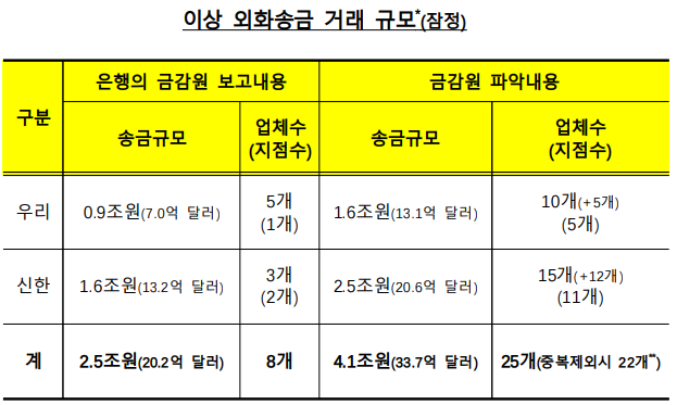 현재까지 2개 은행에서 확인한 이상 외화송금 거래규모는 총 4.1조 원 수준으로 최초 은행이 보고한 규모보다 증가된 상태이다. 우리은행에서는 5개 지점에서 931회에 걸쳐 총 1.6조 원 규모의 이상 외화송금이 취급되었다고 보고 했다. 신한은행에서는 11개 지점에서 1천 회 이상에 걸쳐 총 2.5 조원 규모의 이상 외화송금이 취급되었다고 보고 했다. 다만 이중에는 송금자금에 정상적인 상거래 자금도 일부 포함된 걸로 확인된다.