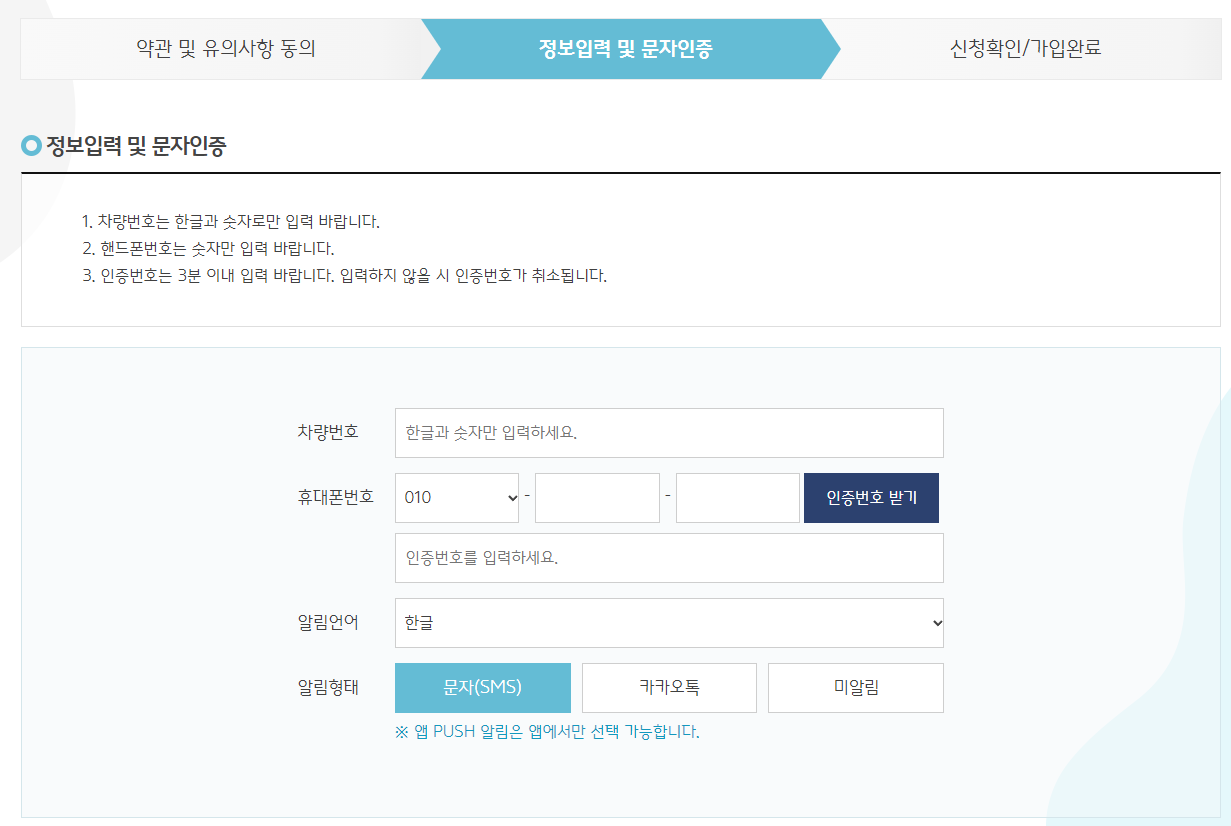 휴대폰 당 차량 1대만 신청 가능합니다.