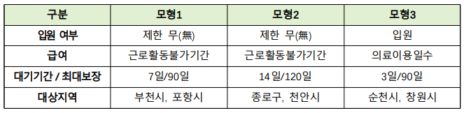 6개 지역에서 신청가능하며 서울 종로, 경기 부천, 충남 천안, 전남 순천, 경북 포항, 경남 창원이다. 대상 지역 거주 취업자는 건강보험공단 지정 협력 사업장 근로자이면 대상에 포함된다. 상병 범위에 따라 3개 모형으로 구분해 효과를 분석할 예정이다.