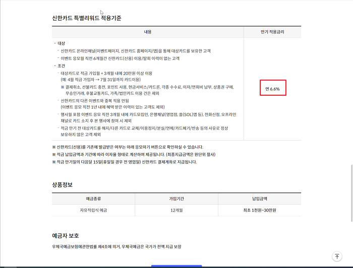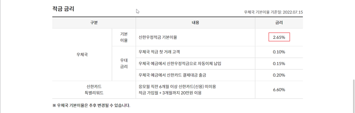 우체국 적금으로만으로는 2.65%에서 우대금리가 가능하나 높은 금리를 받기 위해서는 신한카드 특별 리워드가 필요하다. 신한카드 특별 리 워트 6.6%를 받아 9%대를 넘어갈 수 있다.