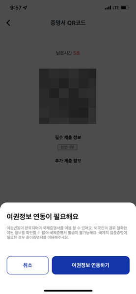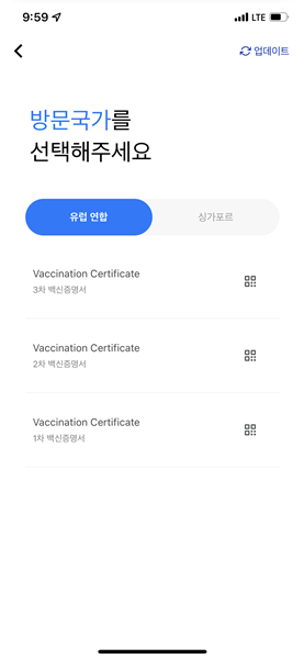 연동이 된 후 방문국가를 선택할 수 있다. 유럽연합 / 싱가포르에 사용이 가능하며 클릭하면 QR 코드가 출력된다. 우리나라에서 접종한 기록을 바로 사용할 수 있다.