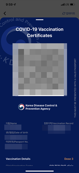 우선 기본적인 개인정보 연동을 하면 현재 코로나 19 예방접종 증명서를 얻을 수 있다. 이상태에서 어플의 상단에 보면 코로나 19 예방접종 내역 발급 및 업데이트가 있다. 이곳을 클릭하면 여권정보를 입력하라고 나온다.