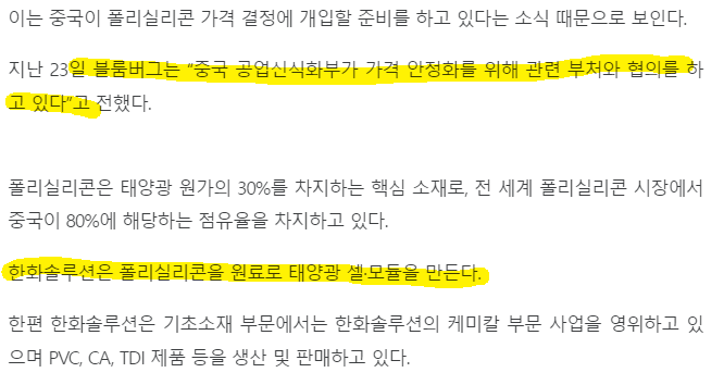 처음에 이야기한 것처럼 독일과 미국에서 인수한 기업이 있는 한화솔루션이 추후 혜택을 많이 볼 거라는 추측이 많다. 관련하여 최근 뉴스에는 글로벌 전력부족의 해답은 태양광으로 이어지고 있고 태양광업체들이다 시주목 받고 있다. 추후 변화가 있다면 다시 확인해보겠다.